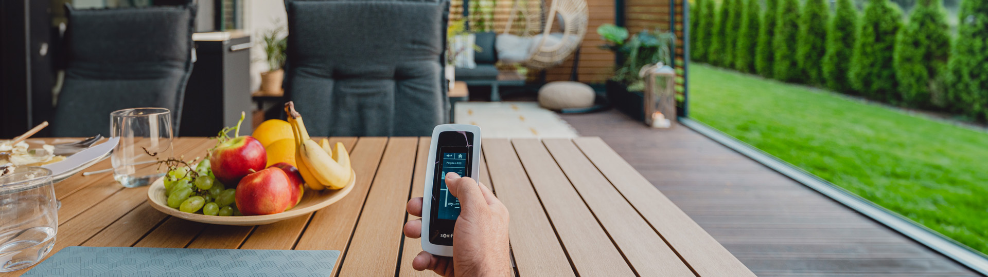 Onze modellen voor terrasoverkapping met doek gebruiken het geavanceerde Somfy besturingssysteem. Dit zorgt voor betrouwbaarheid en uitzonderlijke bedieningskwaliteit. Bediening is mogelijk met een afstandsbediening of een mobiel apparaat uitgerust met de Somfy TaHoma-app.