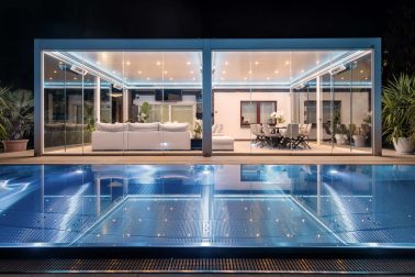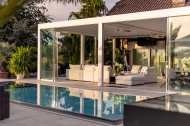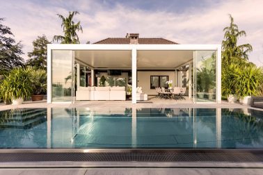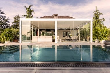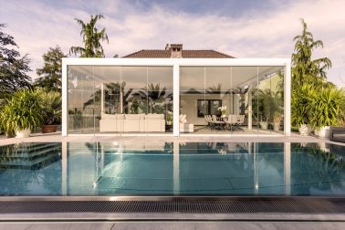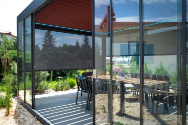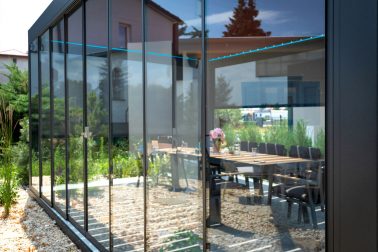 Toepassen van de glazen schuifwand betekent dicht bij de natuur zijn en tegelijkertijd afstand houden. Omdat de installatie niet ingewikkeld is en het vele voordelen biedt voor de gebruikers, past het in elke architectonische context en kan het worden geïnstalleerd in verschillende ruimtes zoals pergola’s, balkons, terrassen en conferentiezalen. Deze panelen beschermen tegen weersomstandigheden als: wind, regen, sneeuw, vuil en geluid, zonder de zichtbaarheid te beperken. De frameloze panelen zijn bijna onzichtbaar wanneer ze gesloten zijn. Glas dat in de constructie wordt gebruikt is veilig in gebruik. Het systeem maakt het gebruik van maatwerk panelen van 50 tot 120 cm breed mogelijk die op trolleys bewegen.